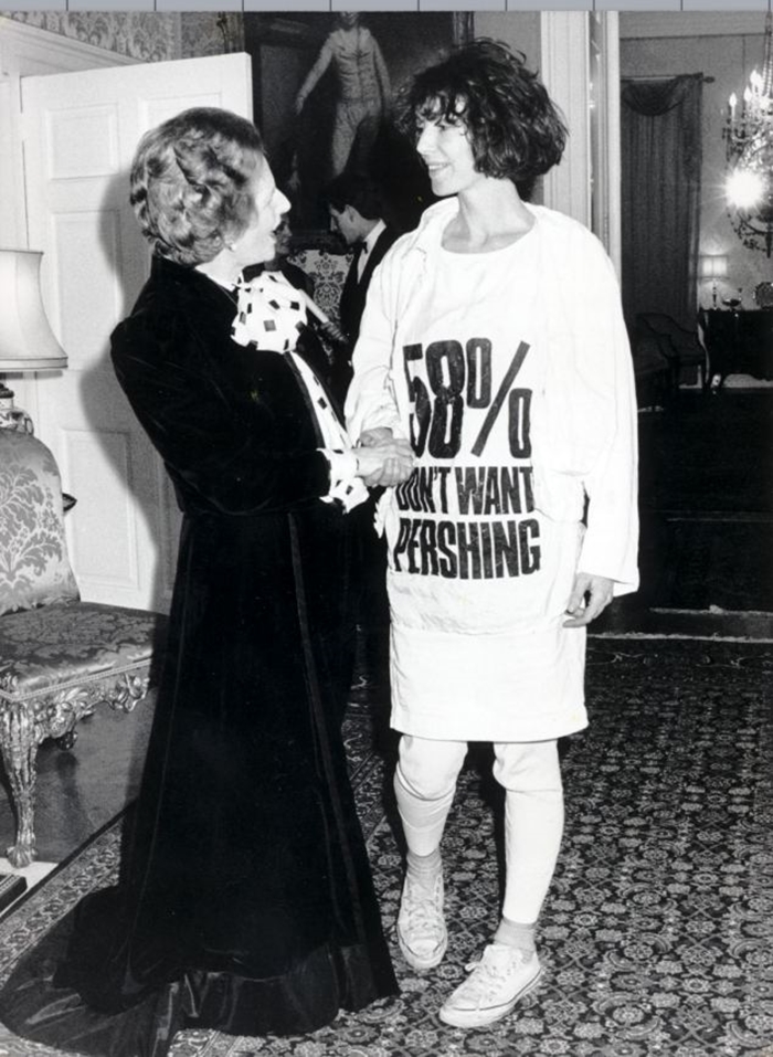 Em 1984, a estilista encontrou-se com a Primeira Ministra do Reino Unido, Margaret Thatcher, vestida em uma das camisetas de sua autoria, estampada com os dizeres “58% don’t want Pershing”, referindo-se a oposição pública do Reino Unido acerca da instalação dasee mísseis Pershing no país.